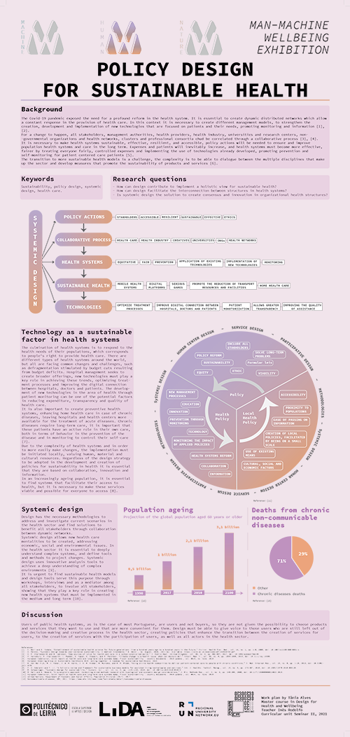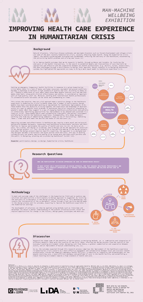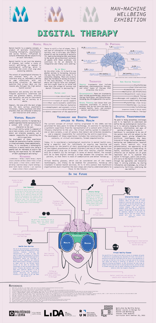 The course prepares students from different backgrounds that relate to health and wellbeing, to acquire knowledge in health experience design for addressing complex data, bridging design in its several subareas (e.g., product design, communication design, multimedia design) with an understanding of the human physiological, neurological and psichological functioning systems, together with the benefits of artificial technological components that may augment the health, wellbeing and overall performance of the human being.